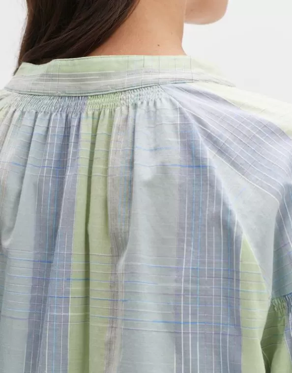 Die Bluse Besticht Durch Die Bewegte Oberflächenstruktur Mit Einem Dezenten Karomuster. Die Liebevollen Details, Wie Die Raffungen Am Kragen Und Ärmelsaum, Verleihen Der Bluse Femininen Charme.