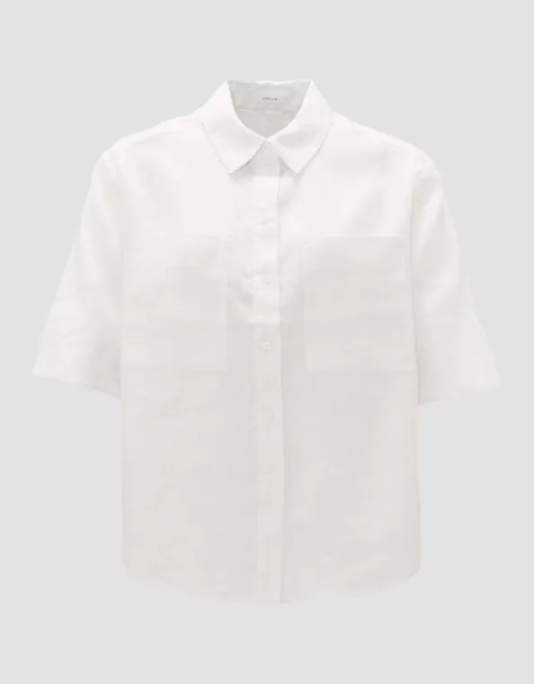 Die Leinenbluse Ist Das Essential Für Die Warmen Tage. Die Klassischen Blusenelemente Wie Kragen Und Knopfleiste Werden Durch Einen Sommerlichen Kurzarm Mit Schlitz Detail Aufgelockert.